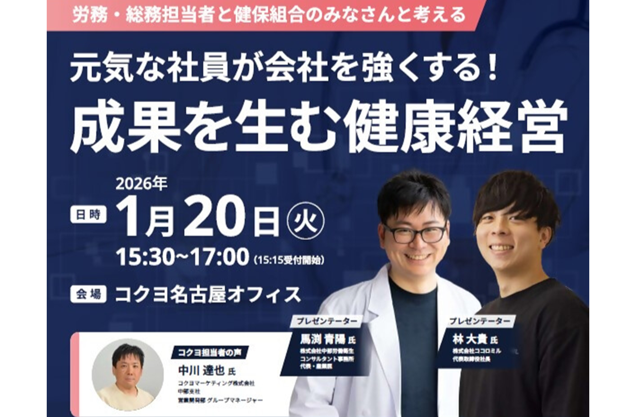 スタートアップの実証支援を実施するなごやまちなか実証「NAGOYA CITY LAB」の本年度採択プロジェクト「働く人を守る!オフィスWell-Beingプロジェクト(in With/W ウィズダブル(コクヨ名古屋オフィス))」の一環として、健康経営について企業の労務・総務担当や健保組合担当者向けに発信するセミナー等を実施します!